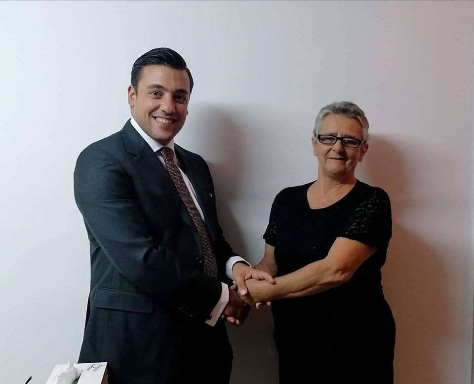 Η πρώτη χειραψία του Αλέξανδρου Κληρίδη με την πρόεδρο του Συνδέσμου μετά την ανάθεση του από το συμβούλιο ως δικηγόρος του Σύνδεσμου Προστασίας των Δικαιωμάτων των Φυλακισμένων και Αποφυλακισθέντων.
