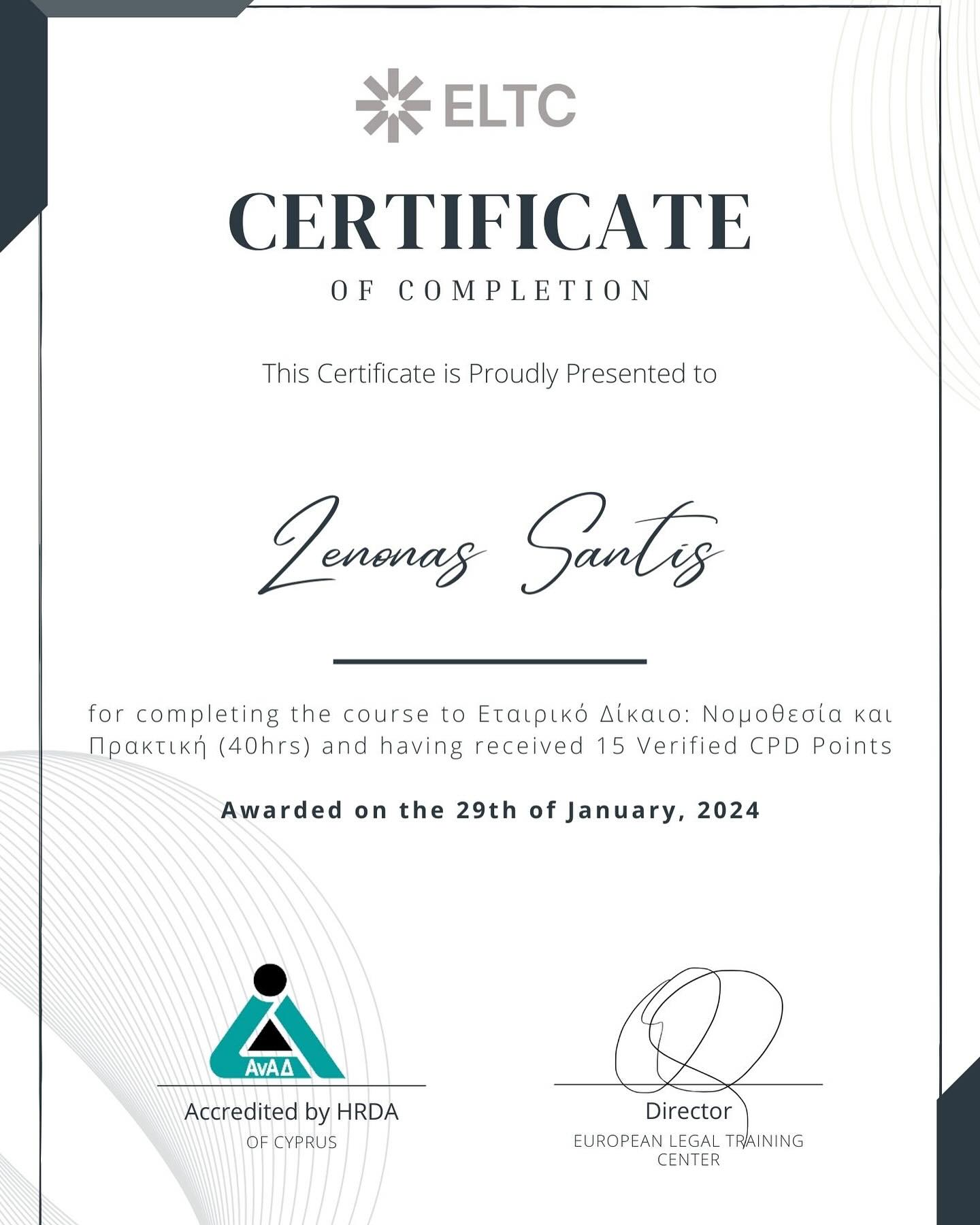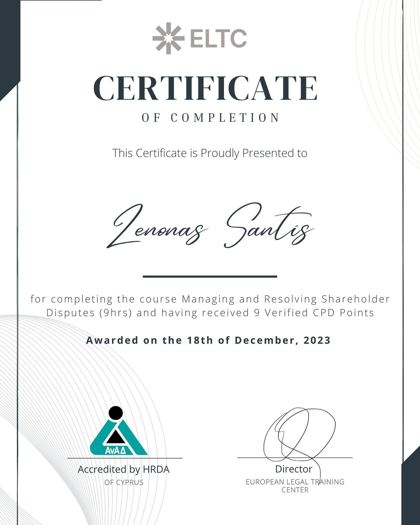 Our associate Zenonas Santis successfully completed 49hrs of training on Corporate Law and Managing/Resolving Shareholder disputes in recognition that our clients demand lawyers who are not only skilled experts in the law but also trusted business partners to advise on their most important matters. CleridesLegal associates attend training on financial literacy, corporate valuation and negotiation, among other areas.